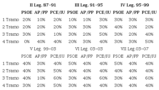 Para medir la presencia de las mujeres en las listas electorales se ha calculado su porcentaje en el cómputo global de la misma y el porcentaje de crecimiento que han experimentado en cada legislatura. Si se observan los datos de la tabla 2, se puede comprobar como la presencia de las listas electorales se va incrementando de manera paulatina a medida que disminuye el porcentaje de hombres. Por otra parte, la representación femenina supera la barrera del 30% en las listas electorales autonómicas a partir de la II Legislatura (1987-91) en el caso del PP, de la III Legislatura (1991-95) en IU, en la IV Legislatura (1995-99) en el PSOE. La razón puede obedecer al sistema de cuotas que tiene ambos partidos, el PSOE e IU. Los primeros fijaron un sistema de cuotas en 1988, 1994 y 1997, y como se puede observar las de 1988, únicamente, tuvieron un impacto de un 6,5%, las de 1994 de un 14,2% y las de 1997 de un 6,2%. En IU sucede algo parecido a lo que sucedió en el partido socialista, por tanto, es lógico pensar que ambas fuerzas políticas llegan a esa barrera del 30% a partir de 1995 corresponda a este sistema de cuotas. En el PP no existía ninguna medida que contribuyese a este hecho. Por tanto, se puede concluir que son los partidos de corte progresista los que se dedican a reservar espacios para la participación política de las mujeres gracias a una política de cuotas (LOVENDUSKI, 2001), mientras que los partidos conservadores se muestran más reacios a la aplicación de este tipo de medidas de corrección.