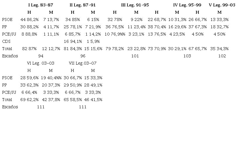 En cuanto al impacto de la Ley Orgánica 3/2007, de 22 de marzo, para la Igualdad Efectiva de Mujeres y Hombres, es menor del esperado. En las elecciones que se celebran inmediatamente después de la puesta en marcha de esta ley, el número de mujeres disminuye en el parlamento autonómico. Tal es así, que en la VII Legislatura (2007-11) todos los partidos sufrieron un retroceso en el porcentaje de mujeres en la cámara, con la única excepción del IU. Eso sí, en la siguiente legislatura las mujeres incrementaron sus porcentajes, salvo en IU, donde experimentaron un ligero descenso de 0,3%. Este crecimiento en el número de mujeres, cuando éstas ya superaban el umbral del 40%, sí que se puede atribuir a los efectos de la ley.