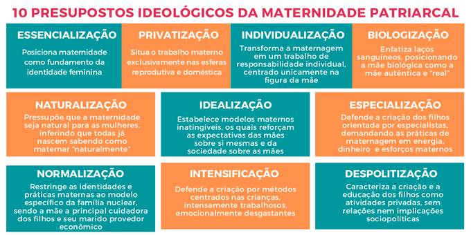 Estes dez pressupostos ideológicos funcionam de modo articulado e podem ser observados tanto nas representações sociais que circulam sobre a maternidade no plano social e histórico, quanto nos sentidos presentes na cultura e nos meios de comunicação. Além de estruturar e manter a maternidade como instituição patriarcal, fragilizam a importância da maternagem e estimulam modelos maternos inatingíveis (Maria Collier de MENDONÇA, 2018), que facilmente contribuem para os sentimentos contraditórios que oscilam da romantização/idealização à frustração.