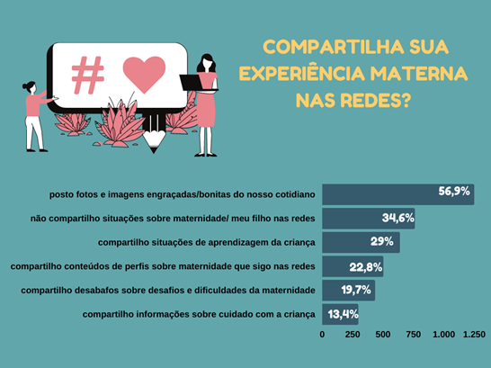 É interessante observar, em outra perspectiva, que uma parte expressiva da amostra (34,6%) afirmou que não costuma compartilhar situações sobre maternidade ou sobre seus filhos nas redes sociais. Em um cruzamento dos dados, foi possível mensurar que a maioria (72%) das mães que não costuma fazer postagens sobre maternidade tem filhos acima dos 5 anos. Por uma via, este dado nos permite inferir que há uma tendência em publicar e compartilhar a experiência da maternidade no período que compreende a primeira infância, quando a prática da maternagem intensiva (HAYS, 1998) tende a ser mais exigente para as mães, uma vez que os cuidados, as cobranças e descobertas são mais recorrentes.