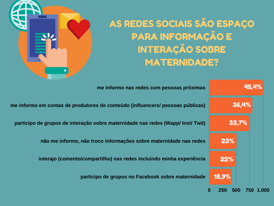 Os dados quantitativos coletados no questionário, especialmente pelo amplo número de respondentes, possibilitaram observar um panorama bastante interessante para compreender como se dão as trocas e interações nas redes sociais sobre maternidade e como esta partilha repercute na experiência de mães que constroem suas narrativas virtuais. Para melhor sistematizar nossa reflexão, iniciamos o debate a partir de três questões fechadas do instrumento, cujos dados quantitativos nos permitem compreender de forma contextual as percepções das mulheres sobre as redes como espaço de informação, troca de experiência e compartilhamento de suas vivências maternas.