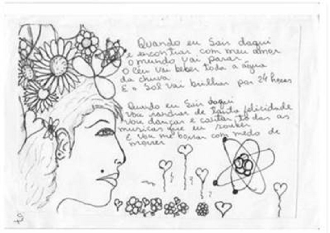 Os relatos caminham ainda pelo amor. Assim como no poema que abre esse texto, muitas outras páginas dos fanzines são destinadas a falar do amor. De se sentir amada. Da solidão de amar sem poder ver, sentir e tocar o seu próprio amor. Falam sobre a possibilidade de se ter alguém convivendo quando em privação de liberdade, mas também da impossibilidade de ser visitada por companheiros “da liberdade”. Os relatos abordam o sofrimento imputado aos corpos e amores que não atendem a qualquer expectativa dos atributos de gênero e sexualidade permitidos na prisão, possibilitando-nos pensar a sexualidade/gênero como dispositivo de gestão dessa população (PADOVANI, 2017b). Ao contrário dos presos heterossexuais que podem ser visitados por suas esposas toda semana, presos LGBTI+ não podiam receber visita de pessoas identificadas como companheiros e nem manter relações sexuais,15 apesar de a legislação abrir precedentes, como consta na decisão de 06 de maio de 2011 do Supremo Tribunal Federal sobre a ADI nº 4277 e a ADPF nº 132, que reconheceu as uniões estáveis civis homossexuais como “igualitárias” juridicamente às uniões civis heterossexuais.