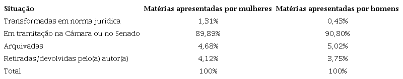 Quando comparamos a situação em que se encontravam as proposições apresentadas,9 conforme apontado no Quadro 1, verificamos que as deputadas, proporcionalmente à sua presença na Câmara, conseguiram transformar em lei três vezes mais proposições do que os deputados. Isso significa que, dos projetos apresentados no período, houve uma maior aprovação de matérias cuja autora foi uma mulher.