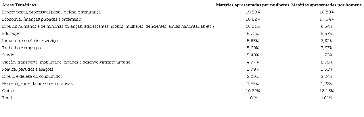 A associação entre os termos indexadores permitiu a identificação de 12 áreas temáticas, tanto em relação à produção dos homens quanto em relação à produção das mulheres. Ao categorizar quais e quantos projetos correspondiam a cada uma dessas áreas, foi possível estabelecer quais as áreas temáticas predominantes na atuação legislativa das mulheres e dos homens, conforme apresentado no Quadro 2. As três áreas em que as mulheres mais produziram matérias legislativas foram, em ordem: (i) Direito penal, processual penal, defesa e segurança; (ii) Economia, finanças públicas e orçamento; (iii) Direitos humanos e de minorias. Os dados demonstram que a atuação das deputadas federais não tem se limitado a temas relacionados às care politics, mas que há também atuação legislativa em áreas historicamente dominadas por homens, como segurança, defesa, economia e finanças. As três áreas em que os homens mais produziram matérias legislativas foram, em ordem: (i) Direito penal, processual penal, defesa e segurança; (ii) Economia, finanças públicas e orçamento; (iii) Indústria, comércio e serviços. Quando comparamos os temas mais trabalhados, pudemos perceber que, embora homens e mulheres tenham atuado equilibradamente em áreas relacionadas ao direito penal e à economia, os temas ligados aos direitos humanos e de minorias foram majoritariamente atrelados à atuação das mulheres (enquanto 16,51% dos projetos das mulheres tratavam deste tema, apenas 6,54% dos projetos dos homens abordavam o mesmo eixo temático).