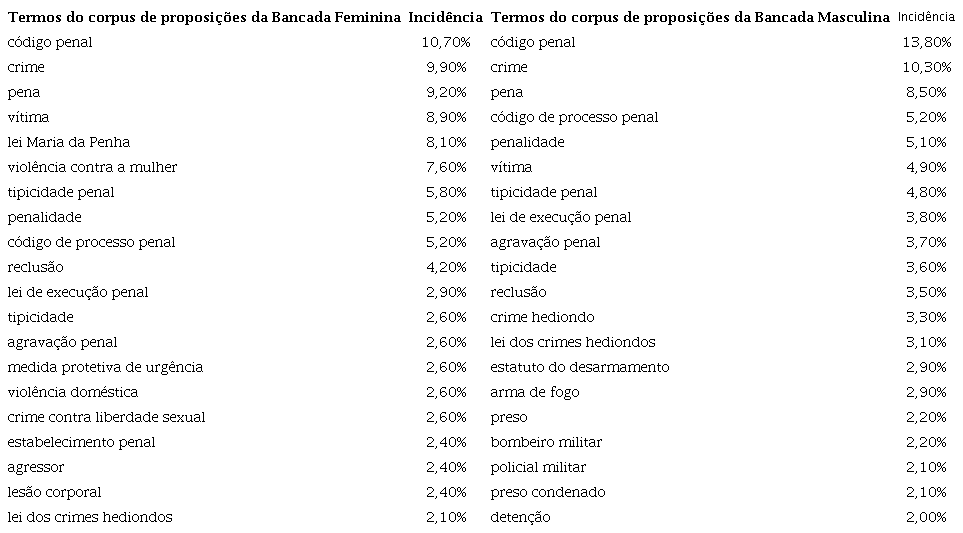 Cada proposição tem, em média, dez termos indexadores (entre significativos e não significativos). Por isso, nas proposições constantes do corpus desta pesquisa, foram encontrados 13.923 termos indexadores distintos. Dada a grande quantidade de termos, foi necessário selecionar aqueles que apareciam com maior frequência. Assim, por meio da plataforma Access, selecionamos 20% dos termos mais recorrentes dentro da amostra de proposições e, em seguida, eliminamos os termos não significativos. Em seguida, ranqueamos os termos significativos mais incidentes nas propostas legislativas apresentadas por mulheres e, em seguida, fizemos o mesmo com aquelas apresentadas por homens.