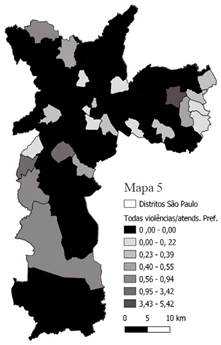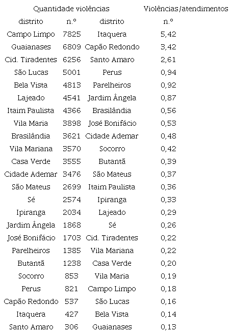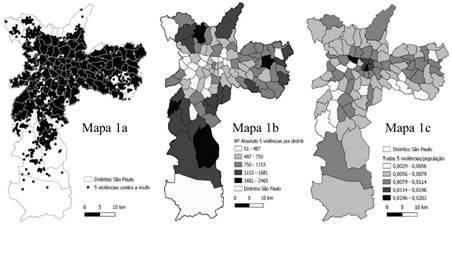 Entre os indicadores passíveis de mapeamento, esse tipo de violência sobressaiu-se principalmente por duas características espaciais singulares: de um lado, por estar fartamente distribuída no espaço urbano, atinge todo o espectro de classes sociais; por outro, em termos relativos2, apesar da violência contra a mulher estar espalhada em toda mancha urbana do Município de São Paulo, as maiores concentrações estão nos distritos do chamado centro expandido e outros subcentros a leste e oeste, regiões das classes de renda diversificada, com farta oferta de empregos, infraestrutura e comércio/serviços.