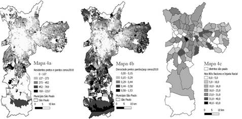 Os crimes de racismo e as violências e injúria racial de 2018, por sua vez, segundo a SSP-SP, estão concentrados em alguns distritos de alta renda e concentração de infraestrutura urbana: centro expandido, sobretudo do quadrante sudoeste, leste e alguns do oeste e sul próximos. Como a concentração das oportunidades de emprego formal e estabelecimentos públicos e privados estão em alguns desses distritos, as violências podem estar relacionadas aos tensionamentos de gênero e raça nestes territórios. A concentração em distritos do centro expandido em alguns subcentros próximos é um padrão semelhante à violência contra as mulheres. Isto corrobora para a tese central do recalque espacial por gênero, raça e classe, uma vez que demonstra um padrão semelhante entre as concentrações de números relativos de violência contra a mulher e de violência de racismo.