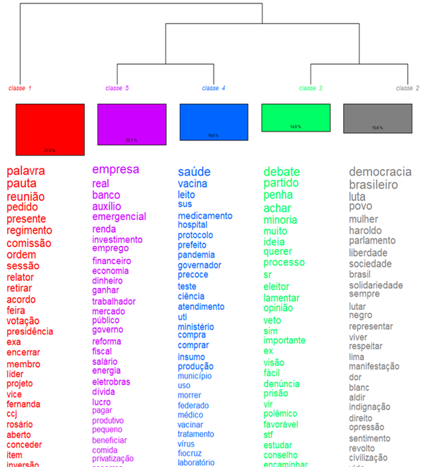 Por outro lado, a classe 1, percentualmente maior, traz o vocabulário típico de organização do discurso parlamentar, especialmente dentro das comissões temáticas que analisam as proposições legislativas. Enquanto a classe 5 traz temas relacionados à economia principalmente no contexto da pandemia de Covid-19, como “auxílio” e “emergencial” - referência ao benefício concedido pelo governo durante a fase mais aguda da crise sanitária -, “investimento” e “emprego”, a classe 4 aborda as questões de saúde preponderantes no discurso parlamentar durante a pandemia, trazendo o léxico relacionado ao tema.