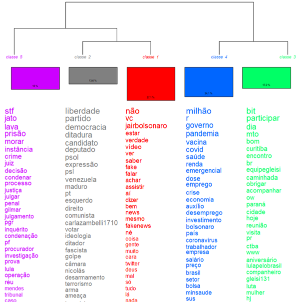 Uma diferença interessante aparece entre as classes 2 e 3: enquanto a primeira faz menção a termos bastante utilizados por Carla Zambelli, incluindo o nome da parlamentar, a classe 3 parece dizer respeito às publicações de Gleisi Hoffmann, com menções à cidade e ao estado da deputada (Curitiba e Paraná), bem como a figuras proeminentes do partido, como Lula. As classes indicam, portanto, a predominância de perfis e temáticas específicas de postagens para cada uma das quatro deputadas. Em comum, contudo, o debate acirrado sobre o governo, realizado a partir dos polos da oposição e da base de apoio.