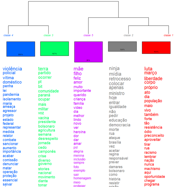 Por sua vez, a Classe 4, que inclui mais de 20% das postagens, traz novamente a temática da violência contra a mulher, especialmente durante a pandemia, com termos como “vítima”, “policial”, “doméstico”, “penha”, “maria”, “ameaça”, “agressor”, “denunciar”, “matar” e “isolamento”. Como indicam pesquisas anteriores sobre a Bancada Feminina da Câmara (MANO, 2020), a violência é uma das únicas temáticas que mobiliza as parlamentares independentemente de suas afiliações ideológicas ou partidárias. Assim, faz sentido que os termos relacionados a ela tenham preponderância numérica no conjunto de discursos mobilizados pelas deputadas, seja na esfera institucional ou no espaço das mídias sociais.