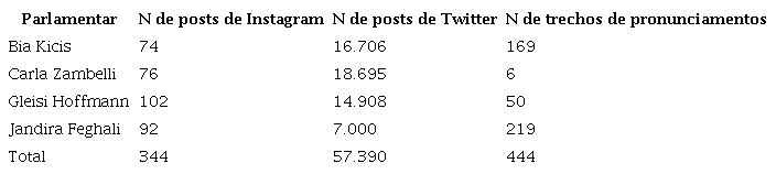 O corpus a ser analisado é oriundo de dois ambientes comunicacionais distintos: as plataformas de mídias sociais e os pronunciamentos realizados no plenário e nas comissões temáticas da Câmara dos Deputados. O conteúdo das mídias sociais foi compartilhado nos perfis oficiais no Instagram e no Twitter das quatro deputadas federais: Bia Kicis, Carla Zambelli, Gleisi Hoffmann e Jandira Feghali. As duas plataformas tiveram um aumento no número de usuários e ainda concentram menos estudos quando comparadas ao Facebook (Raquel TARULLO, 2021).