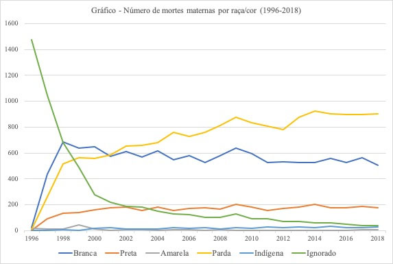 A imagem interseccional que os autores constroem do perfil das gestantes e parturientes que morrem no Brasil reverbera as análises que apontam as desigualdades no risco de morte materna com base em raça/cor e região em que vivem as parturientes (Alaerte MARTINS, 2006). Durante esse mesmo período, a comparação do número de mortes maternas entre grupos raciais aponta dois fenômenos a serem observados (Gráfico 1). O primeiro é que, entre 1996 e 2000, há uma redução substantiva do número de casos de morte materna cuja raça/cor é ignorada e, simultaneamente, aumentam o número de mortes de mulheres brancas e pardas que morreram. O segundo é que a partir de 2001, no entanto, o número de casos entre mulheres brancas começa a diminuir e entre mulheres pardas começa a crescer. Existe uma diferença que se mantém estável ao longo do tempo, com tendência de queda entre as mulheres brancas e aumento entre as mulheres pardas a partir de 2018, dado que tende a se confirmar quando houver mais dados sobre mortalidade materna, sobretudo no que diz respeito ao período pandêmico.