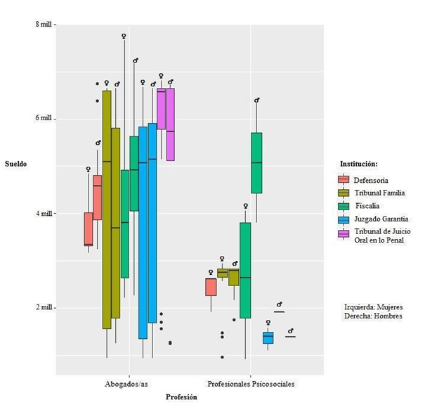 Nuestro trabajo aporta, en general, a la comprensión de cómo se articula el poder en base al género en las instituciones de justicia, a partir de las variables: sueldo, sexo y cantidad de profesionales. En particular, se analizan estas variables en el contexto de i. Tribunales de Juicio Oral en lo Penal; ii. Juzgados de Garantía; iii. Defensoría Penal Pública; Ministerio Público y; iv. Tribunales de Familia. Nos centramos en las instituciones de familia y penales, en tanto la literatura ha sindicado estas áreas como relevantes (Jon PHILLIPS, 2016; Jonathan DICKENS, 2006), e incluso las ha contrastado (María José AZÓCAR BENAVENTE, 2015). La investigación compara estas variables en diversos grupos: entre profesionales de la abogacía y psicosociales; dentro del colectivo de abogados; dentro del colectivo de profesionales psicosociales; dentro de las instituciones de justicia; y entre las instituciones de justicia. Buscamos describir los patrones de género en estas instituciones, preguntándonos por las diferencias de sueldo y presencia de mujeres y hombres en ellas.