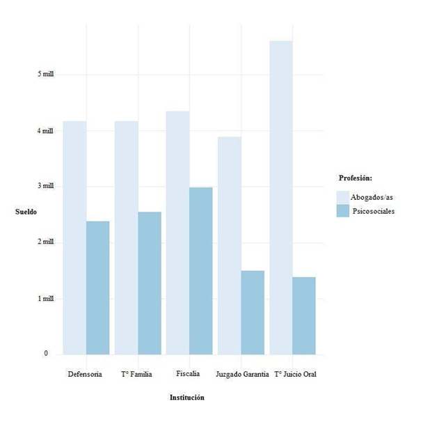 La inclusión de profesionales psicosociales en la justicia, tal como hemos teorizado previamente, implica la disputa por el conocimiento legítimo y relevante de ser aplicado en la justicia. Al integrar esta perspectiva psicosocial, las instituciones se abren -o no se abren- a nuevos saberes que escapan a las lógicas del derecho. Variables como el número de trabajadores y su sueldo se relacionan directamente con la valoración que el Estado hace de sus conocimientos. En este contexto, es llamativa la amplia disparidad de sueldos entre profesionales psicosociales y quienes ejercen la abogacía.