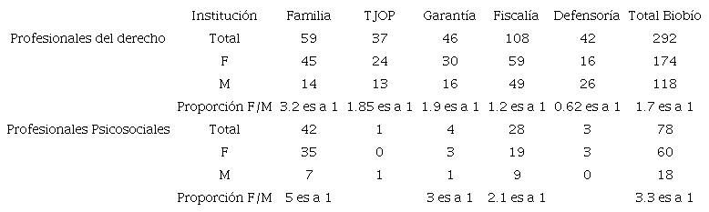 El análisis incluye a personas profesionales psicosociales y del derecho, sin distinguir la labor que realizan o el cargo que detentan. Así, en el caso de profesionales psicosociales, hemos seleccionado a quienes provienen de las carreras de psicología, el trabajo social, asistente social y en pocos casos, de la sociología, dejando fuera otro tipo de profesiones por claridad analítica. Para Tribunales de Familia, Tribunales de Juicio Oral en lo Penal, Juzgados de Garantía y Fiscalía, hemos empleado información del año 2021, mientras que para Defensoría, ocupamos datos del 2017, por ser estos los más recientes a los que obtuvimos acceso.