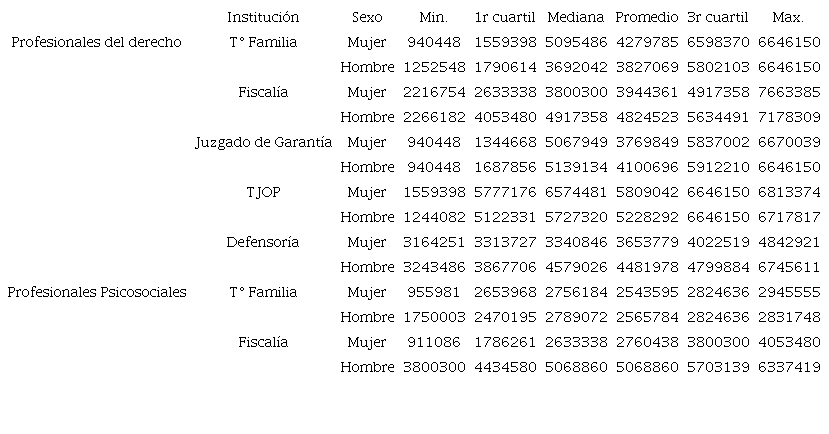 Luego, se presenta una comparación de los sueldos de profesionales psicosociales y del derecho por sexo, en cada institución (Gráfico 1). Con diferentes colores asignados a cada una de las barras, se puede apreciar la distribución de salarios de estos profesionales. Este gráfico es complementado con información (Tabla 2) que contiene los valores de cada cuartil y el promedio. En la tabla se utilizan colores verdes y rojos para facilitar la comparación por columna.