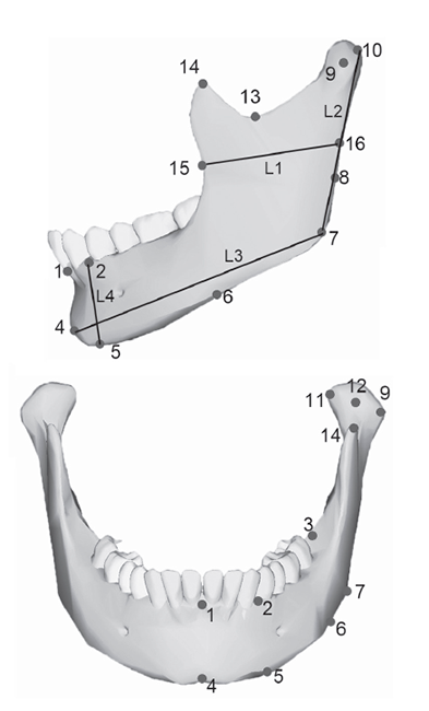 El análisis morfométrico se efectuó sobre 87 mandíbulas. Para este análisis los individuos fueron agrupados en dos grandes categorías etarias: subadultos (incluyendo desde la menor edad representada en la muestra, 7 años, hasta los 18 años; n=28, femeninos=16, masculinos=12) y adultos (18-48 años; n=59, femeninos=31, masculinos=28). La morfología se describió mediante 16 landmarks tridimensionales obtenidos con un Microscribe G2X (Fig. 1, Tabla 1 Apéndice Online 1). Las coordenadas de landmarks fueron superpuestas mediante el método Procrustes por mínimos cuadrados (Rohlf y Slice, 1990).