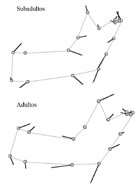 El análisis de regresión realizado sobre los individuos adultos muestra que, a diferencia de lo observado en los subadultos, el TC explica un porcentaje muy reducido (2,6%) y no significativo de la variación en forma. El patrón de cambio en forma asociado al tamaño en individuos mayores a 18 años difiere levemente del observado en los subadultos (Figs. 2 y 3), aunque en líneas generales se observa también el desplazamiento craneal de la parte superior de la rama y el desplazamiento caudal de los landmarks ubicados en el borde inferior de la mandíbula.