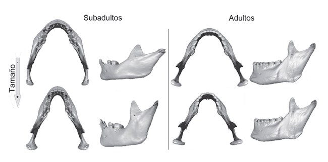 Variación en forma asociada al tamaño obtenida a partir de regresiones en los individuos subadultos y adultos. Las superficies de las mandíbulas representan los cambios de forma observados entre individuos de menor y mayor tamaño con respecto al consenso de cada grupo (subadultos y adultos).