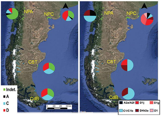 El linaje D1j presentó la mayor profundidad temporal, seguido por D1g, C1 y A2. A su vez, el mismo fue hallado tanto al norte como al sur de Patagonia, pero en sectores exclusivamente costeros (Fig. 2). Los linajes D4h3a y C1 se detectaron en todas las regiones analizadas. Por su parte, D1g y A2 sólo fueron hallados en Norpatagonia (sólo en el sector costero el primero y en los sectores costero y andino, el segundo).
