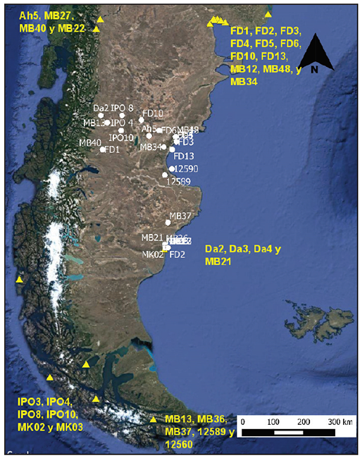Mapa de la región patagónica en el cual se marcan los puntos geográficos de las muestras analizadas en este trabajo utilizadas para el análisis de Procrustes (puntos amarillos) y la ordenación de las distancias genéticas en base las distancias geográficas (puntos blancos). La fecha negra indica el norte geográfico.