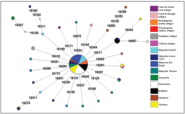 La red mediana del linaje C1 presenta una topología unimodal en estrella, la cual suele interpretarse como producto de un cuello de botella seguido de expansión poblacional (Fig. 4). La mayor cantidad de los individuos se ubican en la posición nodal de este haplogrupo, estando unos pocos individuos de diversas poblaciones modernas y antiguas diferenciadas por unas pocas mutaciones. De las muestras analizadas en este trabajo sólo dos se diferenciaron por una mutación: una de la costa de Santa Cruz (MB21) con la mutación 16171G y otra procedente del Canal de Beagle (MB36) con la mutación 16291T (Tabla 3).