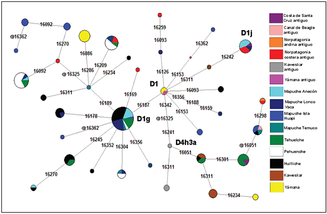 La red que incluye los linajes D1 y D4h3a presenta una topología multimodal (Fig. 5). El motivo nodal del primero (16223T, 16325C y 16362C) posee una baja representación y sólo se encuentra presente en Yámana. Sólo un individuo antiguo analizado aquí presenta este clado (MB34), pero con las mutaciones adicionales 16093C, 16126C y 16259T. Las variedades mayoritarias fueron D1j, D1g y D4h3a. Cuatro individuos (FD3, FD4, FD5 del Golfo de San Matías y Da4 de la costa de Santa Cruz) presentaron la variedad D1j (D1+16242T y 16311C) compartida por grupos Mapuche de Anecón y Lonco Vaca. Por su parte, el linaje D1g (D1+16187T) estuvo presente en cuatro individuos del Golfo de San Matías. La muestra FD6 presentó las mutaciones 16189C y @16325C, compartiendo motivos con múltiples grupos actuales. Uno de los extractos de esta muestra presentó la mutación 16092C y compartiría haplotipo con grupos Tehuelche, Mapuche y Pehuenche, pero no pudo confrmarse hasta el momento. Dos individuos (MB12 y MB48) presentaron las mutaciones 16189C y 16209C, la cual es compartida por Mapuche, Tehuelche y Pehuenche. La última muestra perteneciente a este linaje es FD13, la cual posee la mutación 16169T y no es compartida por ninguna población actual o antigua aquí analizada.