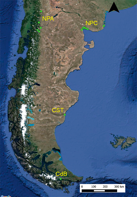 Regiones geográficas de donde proceden las muestras analizadas en este trabajo (puntos verdes). NPC: Norpatagonia costera (n: 23). NPA: Norpatagonia andina (n: 17). CST: Costa de Santa Cruz (n: 6). CdB: Canal de Beagle (n:4).