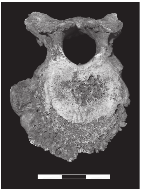 Osteoartrosis y porosidad identificada en una misma articulación (cara superior de cuerpo vertebral dorsal).
