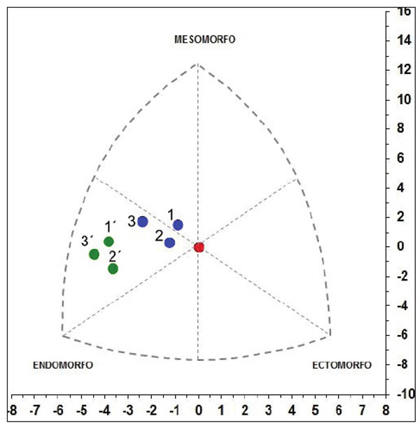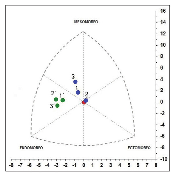 Se calculó el somatotipo promedio por cada categoría de agrupamiento: sexo, edad y escuela. Una vez obtenidos los valores promedios de cada componente del somatotipo, se obtuvo un par ordenado de valores (X;Y) por grupo, que permitió ubicar espacialmente a los somatotipos grupales en una somatocarta: