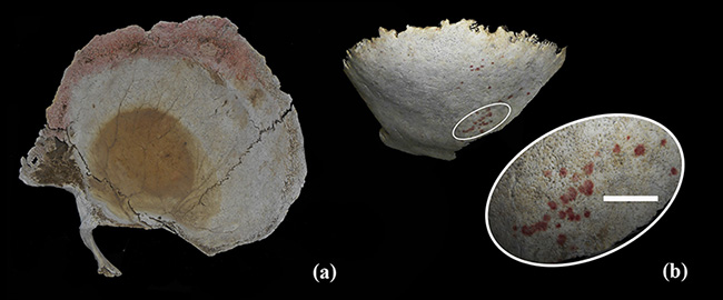 a) Fragmento de cráneo recuperado en Fa con exposición diferencial y coloración rojiza cubriendo parte de la superficie de fractura. b) Fragmento de cráneo recuperado en LM con coloración rojiza en forma de pequeñas motas.