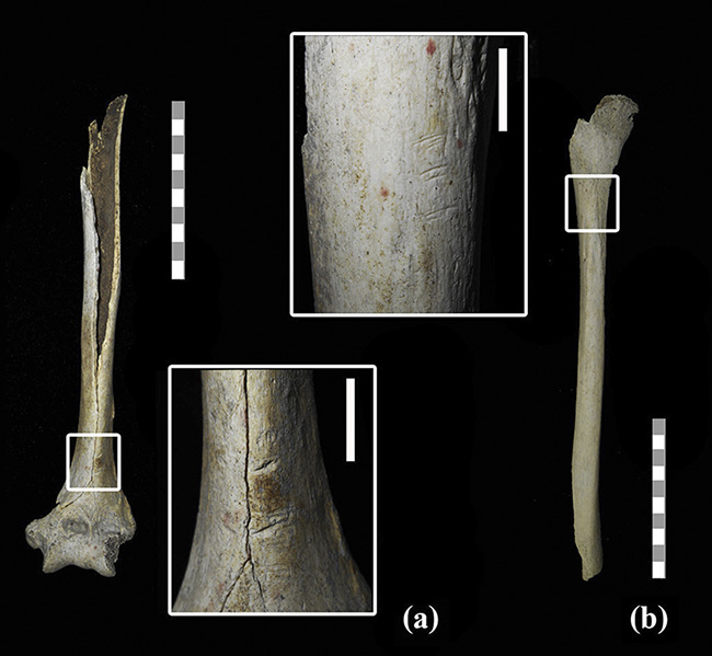 Evidencias de procesamiento antrópico en elementos de LM. a) Húmero izquierdo con marcas cortas y profundas (vista anterior). b) Tibia izquierda con incisiones paralelas y subparalelas (vista posterior).