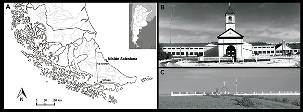 Se analizan columnas vertebrales de 16 individuos adultos exhumados del cementerio de la MSLC, el cual estuvo activo entre los años 1897 y 1948 (Casali, 2011) y dista 12km al norte de la ciudad de Río Grande, Tierra del Fuego (TdF), Argentina (Fig. 1). Los 16 sujetos fueron inhumados en el sector sur del cementerio, superando el metro de profundidad y con heterogeneidad en cuanto a las orientaciones (NO-SE, SE-NO, NE-SO y SO-NE). La posición de enterramiento es decúbito supino, con los brazos extendidos o semiflexionados sobre el pecho, en 13 de los individuos; se trata de una posición tradicionalmente ligada al rito cristiano. Los otros tres individuos fueron inhumados en decúbito prono, dos casos y decúbito lateral izquierdo, un sujeto. De los 16 individuos, 14 se encontraban contenidos en cajones de madera, careciendo de ataúd dos de ellos. A su vez, se pudieron recuperar fragmentos textiles, zapatos y/o botones en diez de los sujetos. Los restos óseos objeto de estudio en este trabajo, se encuentran actualmente en el reservorio del Laboratorio de Ecología Evolutiva Humana (LEEH) en la ciudad de Quequén-Necochea. Es importante señalar que los procedimientos desarrollados con los restos humanos están de acuerdo con leyes locales y recomendaciones éticas internacionales. A pesar de ser una muestra reducida, tiene la particularidad de estar acotada temporal y espacialmente, además de contar con información procedente de fuentes históricas, situación poco frecuente en esta región. Se ha de señalar que, a diferencia de la MSLC, los cementerios de las otras dos misiones de la región (Dawson y Ushuaia) hasta el momento no han sido analizados de manera sistemática desde el ámbito de la bioarqueología y la historia (Casali, 2011; García Laborde, 2017). Esta serie de características diferenciales, aportan una mayor relevancia a los análisis que se realizan sobre estos sujetos.