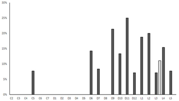 Frecuencias de casos de nódulos de Schmörl según las vértebras afectadas en la MSLC (negro) respecto a los resultados del norte de Tierra del Fuego (gris) presentados por Suby (2014).