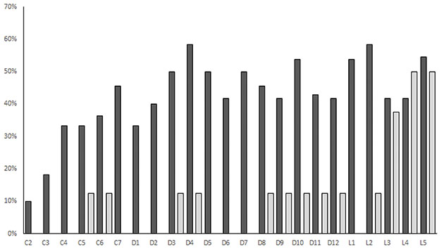 Frecuencias de labiación (gris oscuro) y eburnación (gris claro) en las carillas articulares interapofisarias según las vértebras afectadas.