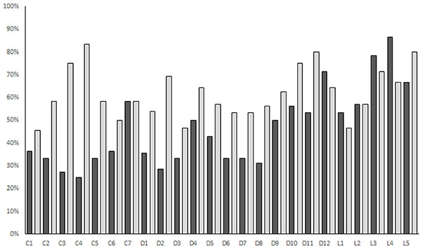 Entre las lesiones de carácter artrósico que afectan a los arcos vertebrales, se observa una progresión ascendente de las frecuencias cráneo-caudalmente; tanto en el caso de la labiación, como en el de la eburnación de las carillas interapofisarias (Fig. 5). Sin embargo, cada uno de los signos ofrece una distribución diferente de máximos y mínimos relativos. Para la labiación se encuentran mínimos en C3-C4, D2, D6-D8, D11, L1-L2 y L5; y máximos en C1-C2, C7, C4, D10, D12 y L4. Mientras que los mínimos para la eburnación se localizan en C1, C6, D3, D5-D7 y L1, y los máximos se sitúan en C4, D2, D4, D10-D11 y L5. Todos los individuos presentan eburnación y labiación. Con respecto a la prevalencia de los signos patológicos en relación con el sexo, la labiación tiene una mayor prevalencia en los individuos masculinos, excepto en la región dorsal, aunque estas diferencias no son significativas (χ2pvértebra:0,99; χ2pregión:0,19) (Tabla 3). Sin embargo, la eburnación es más frecuente en los sujetos femeninos, fundamentalmente en la región torácica, si bien estas diferencias tampoco son significativas (χ2pvértebra:0,99; χ2pregión:0,58) (Tablas 3 y 6 - 6cont.).