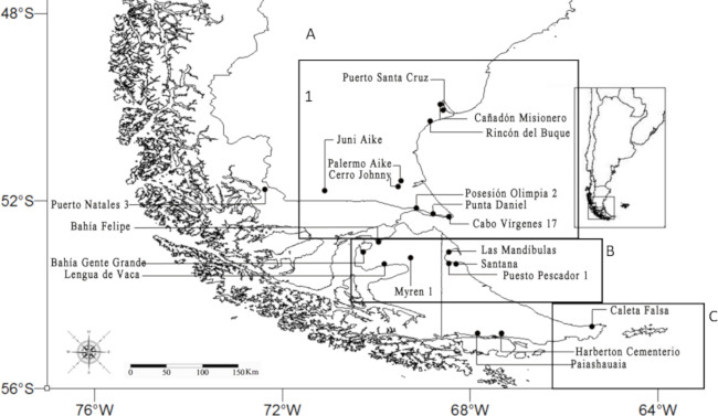 Localización de los sitios arqueológicos de donde provienen los individuos analizados en este trabajo. Referencia: 1:Sitios del interior delimitados por un circulo; A: Sta Cruz/Magallanes; B: Norte de Tierra del Fuego; C: Sur de Tierra del Fuego.