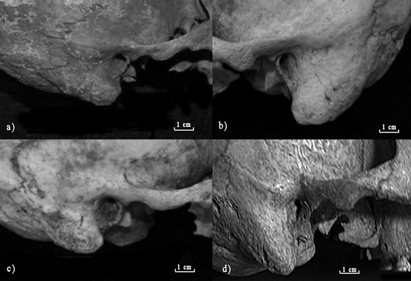 Desde un punto de vista metodológico, el estudio de la EAE ha sido realizado en restos humanos mediante dos tipos diferentes de método de registro (Crowe et al., 2010; Standen et al., 1997), lo que en principio dificulta la comparación de resultados. Sin embargo, ambos métodos presentan criterios idénticos en cuanto al desarrollo de las lesiones del CA, característica importante ya que condiciona los síntomas que padecerán los individuos, como por ejemplo la pérdida de audición. La metodología de Standen et al. (1997) aplicada en este estudio permite evaluar la localización y la forma de la EAE, resultando de utilidad en aquellos individuos que presentan un tamaño grande de EAE en donde la variable forma (sea esferoidal u ovoidal) resulta distinguible, al contrario, en aquellos con tamaños pequeños o medianos. Sin embargo, no fue posible distinguir este aspecto, salvo en el individuo del sitio Caleta Falsa esqueleto 8.4, el cual presentó una EAE de tamaño grande y que se distingue este rasgo de forma ovalada sobre la pared posterior y anterior del conducto auditivo (Fig. 2d).