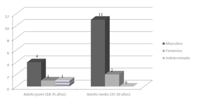 Los individuos masculinos presentaron mayor frecuencia de EAE (83,3%; 15 de 18 individuos), que los individuos femeninos (60%; 3 de 5 individuos). El 75% (6/8) de los adultos jóvenes (20-35 años) presentaron EAE, porcentaje similar al registrado entre los adultos medios (81,3%; 13/16) (Fig. 3; Fig. 4). Sin embargo, no se encontraron diferencias estadísticamente significativas cuando se evaluaron las diferencias de prevalencia de EAE en relación al sexo y la edad de muerte (p=0.9 en ambos casos).