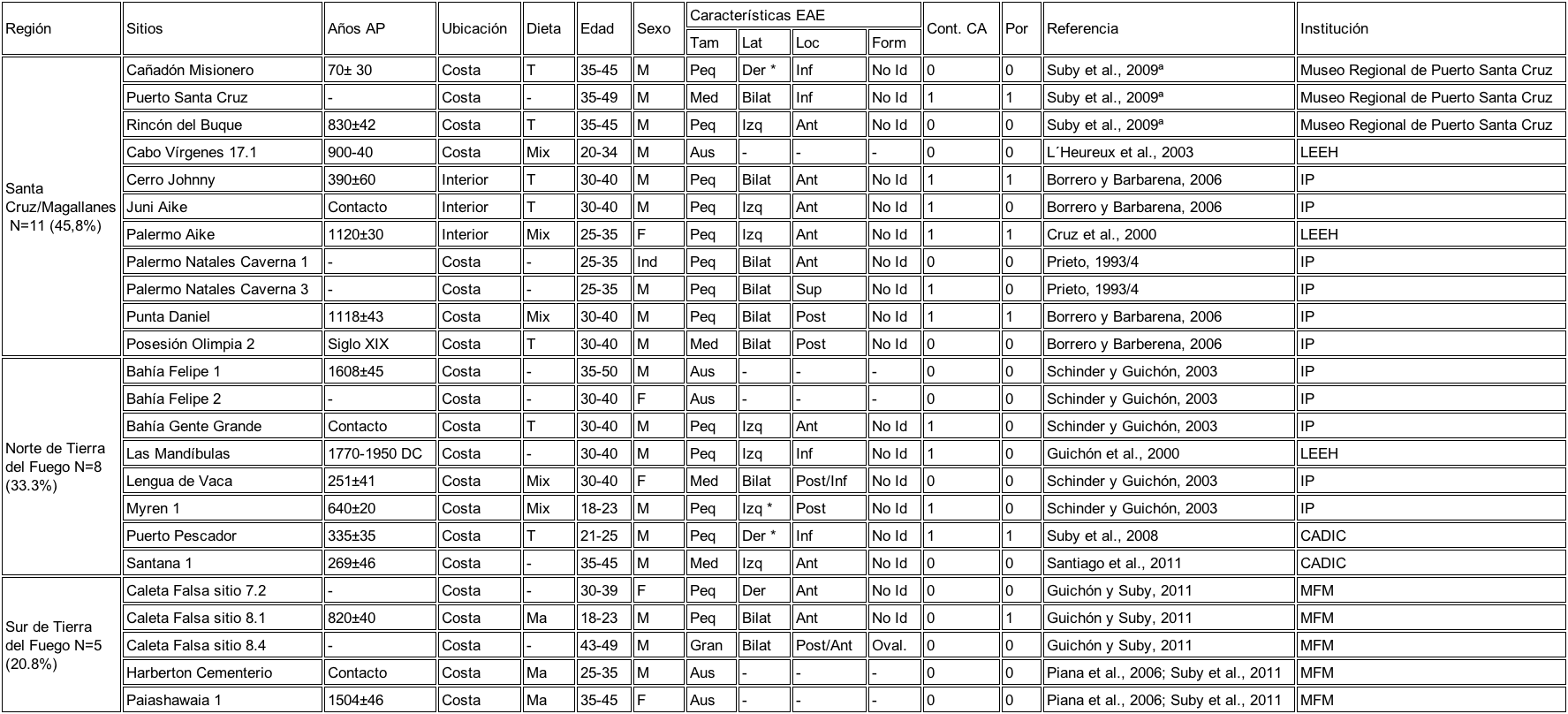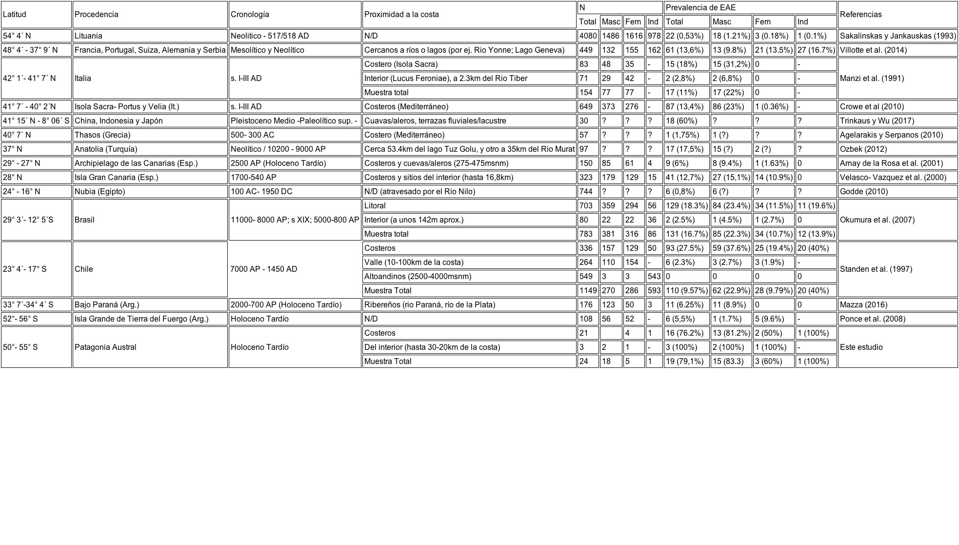 Las prevalencias de EAE en muestras de individuos del pasado son variables. La Tabla 4 sintetiza los principales estudios publicados recientemente sobre EAE, registrada en individuos de Sudamérica, Norte y Sur de Europa, Norte de África (i.e. Egipto), Medio Oriente y Eurasia oriental (i.e. China). Esta distribución geográfica puede estar influenciada con el mayor número de estudio paleopatológicos realizados en algunas de ellas. Las evidencias más antiguas datan de cerca de 10 mil años AP en Anatolia (i.e. Turquía), mientras que no son frecuentes los estudios en muestras con cronologías más recientes. Al comparar los resultados obtenidos en este trabajo con los antecedentes sintetizados en la Tabla 4, se observa una mayor prevalencia de EAE en la muestra analizada en comparación a los porcentajes registrados en individuos de otras poblaciones que habitaron latitudes mayores a 45° N y S (e.g. Ponce et al., 2008; Villotte et al., 2014). Incluso el porcentaje de individuos con EAE es mayor en comparación con poblaciones que habitaron entre los 30º y 45º (Crowe et al., 2010; Manzi, Aperduti y Passarello, 1991; Mazza, 2016; Ozbek, 2012). Por último, Hrdlicka (1935) observó un 0.2% de EAE en 1000 cráneos pertenecientes a una colección de restos de esquimales (Inuit). Sin embargo, esta última referencia no indica la procedencia y la cronología de la muestra por lo que no ha sido agregada a la Tabla 4.