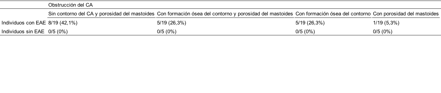 La formación de hueso nuevo en el contorno del CA afectó al 41,7% (10 de 24 individuos) del total de la muestra y un 52,6% (10 de 19 individuos) del total de los individuos que presentaron EAE (Tabla 1). La porosidad del mastoides se registró en un 25% (6/24) sobre el total de los individuos y un 31,6% (6/19) sobre el total con EAE (Tabla 2). De los 19 individuos con EAE, el 42,1% (n=8) presentó solo obstrucción del CA, el 26,3% (5 de 19) obstrucción del CA y formación de hueso del contorno y porosidad, el 26,3% de los individuos (5 de 19) mostró obstrucción del CA y formación de hueso y en el 5,3% (1 de 19) de los individuos se registró la presentó obstrucción del CA y porosidad del mastoides (Tabla 2). Ninguno de los individuos sin obstrucción del canal presentó porosidad del mastoides o formación de hueso sobre el contorno del CA (Tabla 2).