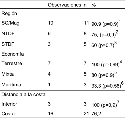 En relación con la proximidad a la costa, el 76,2% (16/21) de los individuos recuperados en sitios costeros presentaron EAE, mientras que el 100% (3/3) de los individuos de sitios del interior mostraron este rasgo (Tabla 3). El 55,6% (5/9) de los restos recobrados en sitios costeros tenía una economía de subsistencia basados en su predominancia en recursos terrestres, en el 33,3% (3/9) la dieta era mixta y en el 11,1% (1/9) predominaba una economía en base a recursos marinos (Tabla 1). En este caso ninguna de las categorías establecidas para la distancia a la costa resultó estadísticamente significativa (Tabla 3).