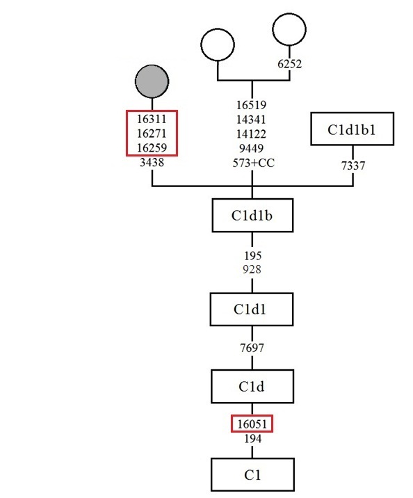 Sección del árbol filogenético de C1, modificado de Perego et al. (2010). El círculo gris representa la muestra de un individuo kolla de Salta. Los recuadros rojos señalan las mutaciones identificadas en la secuencia del individuo 46SE de Santiago del Estero que permiten asumir su pertenencia al linaje C1d1b.