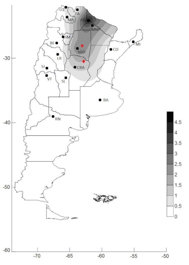 Mapa de isofrecuencias del linaje C1d1b+16259 16271 16311 en poblaciones contemporáneas del cono sur de Sudamérica -con excepción de las secuencias reportadas en Montevideo (Figueiro et al., 2011) y en Salta (Perego et al., 2010), por no presentar frecuencias poblacionales-. LQ: La Quiaca, Jujuy; TA: Tartagal, Salta; MA: Maimará, Jujuy; SM: Santa María, Catamarca; BE: Belén, Catamarca; SJ: Provincia de San Juan; VT: Villa Tulumaya, Mendoza; LR: Provincia de La Rioja (Motti, 2012); CBA: Provincia de Córdoba; SL: Provincia de San Luis (García et al., 2018); SGO: Sur de la provincia de Santiago del Estero (Pauro et al., 2013); FO: Wichí de Formosa (Cabana et al., 2006); MNP: Misión Nueva Pompeya, Chaco (Sevini et al., 2013); MI: Misiones; CO: Corrientes; BA: Buenos Aires; RN: Río Negro (Bobillo et al., 2010). Los rombos rojos indican la procedencia de los individuos arqueológicos que presentan este haplotipo.