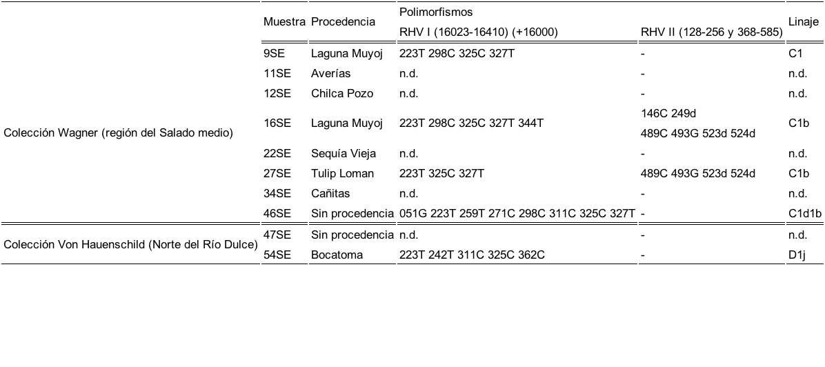 Los estudios genéticos publicados hasta la fecha sobre poblaciones contemporáneas de Santiago del Estero tampoco hallaron evidencia de flujo génico significativo con grupos andinos, en tanto que reportaron varios linajes mitocondriales compartidos con poblaciones de las Sierras Pampeanas (en particular con Córdoba) y del Gran Chaco (Pauro et al., 2013). Teniendo en consideración estos antecedentes, resulta interesante destacar la continuidad de algunos linajes maternos observados en la muestra arqueológica aquí analizada. En la población de las localidades de Sumampa y Villa Atamisqui, ubicadas en el sur de la provincia de Santiago del Estero, los linajes D1j y C1d1b+16259 16271 16311 se encuentran presentes en una frecuencia del 13,8% y del 2,5%, respectivamente (Pauro et al., 2013). Sin embargo, no se ha detectado el haplotipo C1b+146 16344 de la muestra arqueológica 16SE en estas localidades. Esto podría deberse, bien a un error de muestreo, bien a la pérdida de linajes por procesos demográficos del pasado, como la contracción y/o el reemplazo poblacional.