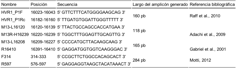 Debido a la fragmentación del ADN en las muestras antiguas, se amplificaron por PCR tres fragmentos solapantes menores a 221 pares de bases (pb) de la Región Hipervariable I (RHV I), entre las posiciones 16023 y 16410, utilizando los iniciadores: HVR1_P1F y HVR1_P1Rc (Raff et al., 2010), M13-L16120, M13R-H16239 y M13-L16208 (Adachi et al., 2009), y R16410 (Gabriel et al., 2001) (Tabla 2). A fin de refinar la caracterización de los subhaplogrupos de C1, se secuenció un fragmento de 284 pb perteneciente a la Región Hipervariable II (RHV II), en busca del polimorfismo 493G, diagnóstico de C1b, utilizando los iniciadores F314 y R597 (Motti, 2012) (Tabla 2). Las reacciones de PCR se llevaron a cabo en un volumen total de 55μl conteniendo 1X de GoTaq Buffer (Promega), 0,20mM de cada dNTP (Promega), 0,28μM de cada iniciador, 2,75U de GoTaq DNA Polymerase (Promega), 0,1 mg/ml de BSA y 5-6μl de la muestra de ADNa. En las reacciones de amplificación se incluyeron controles positivos y negativos. Las condiciones de ciclado fueron: un ciclo inicial de desnaturalización durante 6 minutos a 94ºC; 50 ciclos de desnaturalización por 30 segundos a 94ºC, hibridación por 45 segundos a 53ºC y elongación por 45 segundos a 72ºC; y un ciclo de elongación final de 5 minutos a 72ºC. Los productos de PCR se enviaron a Macrogen (Seúl, Corea) para su purificación y secuenciamiento de ambas cadenas de ADN. Las secuencias obtenidas fueron corregidas manualmente y alineadas con la Secuencia de Referencia revisada de Cambridge (rCRS) (Andrews et al., 1999), usando el programa Sequencher versión 5.3 (Gene Codes Corporation). Posteriormente, fueron asignadas a los subhaplogrupos correspondientes utilizando el programa HaploGrep 2 (Kloss-Brandstaetter et al., 2011), que se basa en la base de datos Phylotree (van Oven, 2015), y mediante búsqueda bibliográfica.