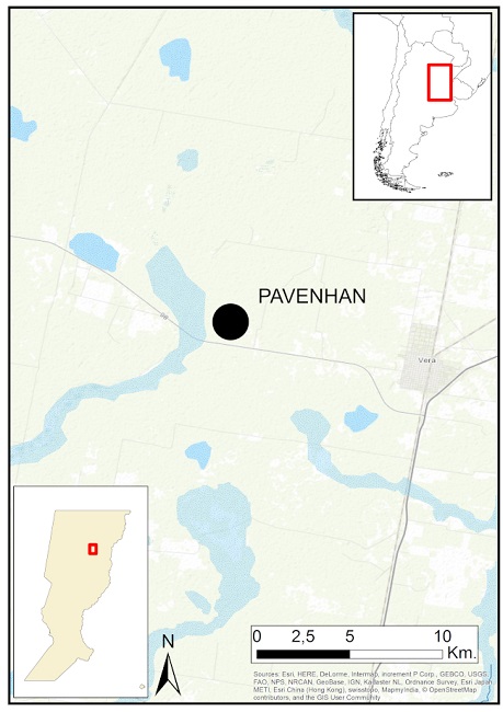 A inicios del año 2009, a partir de la realización de actividades agrícolas de nivelación mecánica del terreno en la estancia Pavenhan (departamento de Vera, provincia de Santa Fe) (Fig.1), quedaron al descubierto significativas evidencias de presencia de restos óseos humanos. El hallazgo arqueológico fortuito se encontró en vinculación con la Laguna El Palmar, y fue comunicado inmediatamente, tal como es norma en estos casos, a las autoridades municipales competentes. En dicha oportunidad el director del Museo Municipal de Arqueología y Paleontología de la ciudad de Reconquista, Profesor Dante Ruggeroni, fue el encargado de responder y dar inicio a las tareas de rescate y estudio preliminar del material. Se procedió a la exhumación de los restos con una estrategia de recuperación en bloque y por unidades anatómicas individuales, para su posterior traslado y almacenaje en un depósito adecuado para tal fin en las instalaciones del museo. Una vez ingresados los restos como acervo patrimonial de la institución, se solicitó su análisis al equipo de investigaciones antropológicas forenses de la División Antropología del Museo de la Plata (Facultad de Ciencias Naturales y Museo, Universidad Nacional de La Plata). Realizadas las gestiones correspondientes se trasladaron los restos en carácter transitorio a fin de proceder a su estudio. Por lo tanto, en esta oportunidad se presentan los resultados del análisis del material osteológico recuperado, considerando el estado de preservación del material, la descripción demográfica de la muestra y su análisis paleopatológico. Por último se propone una interpretación preliminar del contexto a fin de poner en discusión la práctica inhumatoria representada en el marco de la problemática arqueológica regional.