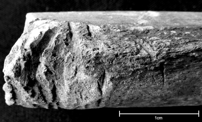 Las marcas observadas se condicen en su mayoría con la acción de roedores, dispuestas en las diáfisis de huesos largos en forma concentrada y exhibiendo distintas profundidades. A su vez, uno de los fémures presenta una marca circular (puncture) probablemente generada por la acción de un carnívoro en el sector proximal del hueso. Sólo en cuatro diáfisis de huesos largos se observaron marcas atribuibles a la acción antrópica, todas ellas de corta longitud, con poca profundidad y de disposición oblicua o transversal al eje longitudinal del hueso (Fig. 3). En numerosas piezas óseas se relevó la presencia de carbonato de calcio, lo cual otorga al conjunto óseo una coloración blanquecina impidiendo el relevamiento de ciertos rasgos anatómicos.