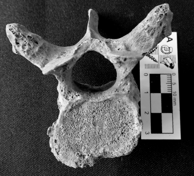 Las patologías de tipo osteoarticular observadas se remitieron exclusivamente a la columna vertebral, a excepción de una osteofitosis observada en las carillas articulares para la 1º costilla de un manubrio esternal. En las vértebras en tanto se observaron dos de ubicación torácica con osteofitosis moderada (Fig. 6) y dos apófisis espinosas anquilosadas, probablemente por efecto de una osteoartrosis severa. En dos fragmentos pertenecientes a vértebras torácicas se observaron lesiones compatibles con hernias discales verticales o nódulos de Schmörl, en ambos casos de grado 1 o leve.