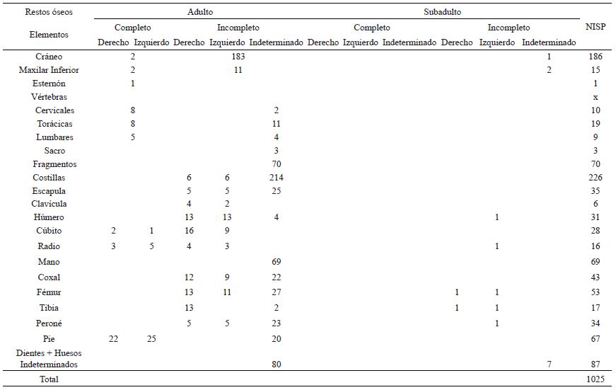 El grado de preservación descrito dificultó la caracterización biológica de los individuos, no obstante se lograron establecer parámetros para su concreción. El conjunto óseo está conformado por un total de 1025 elementos óseos (NISP=1025) (Tabla 1). Se estimó el Número Mínimo de Individuos, el cual fue de 15 individuos (NMI=15) a partir de los huesos temporales izquierdos. De acuerdo a los parámetros ya establecidos se determinó que 13 de ellos eran de edad adulta (mayores de 20-22 años) y 2 subadultos. A partir del grado de formación y erupción dentaria se estimó que uno de los individuos subadultos tendría una edad de muerte de 2 años ± 8 meses, clasificado como infantil; mientras que el subadulto restante superaría los 12 años de edad (adolescente).
